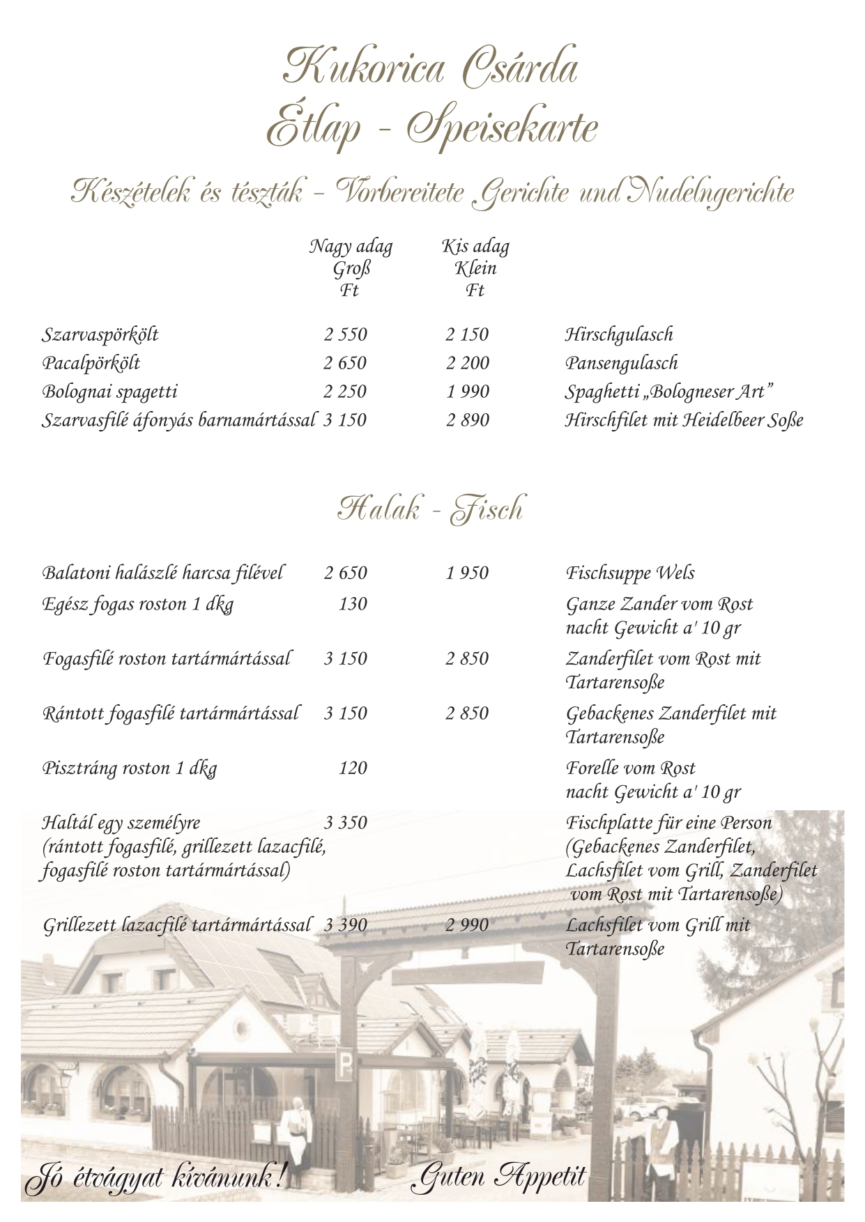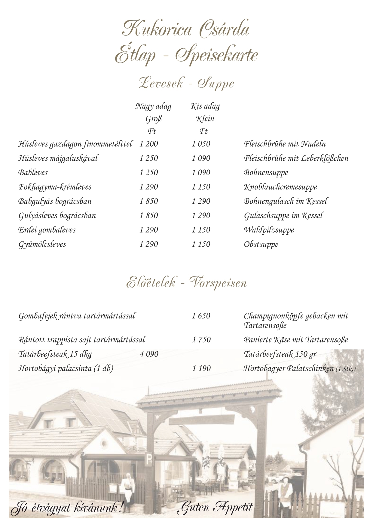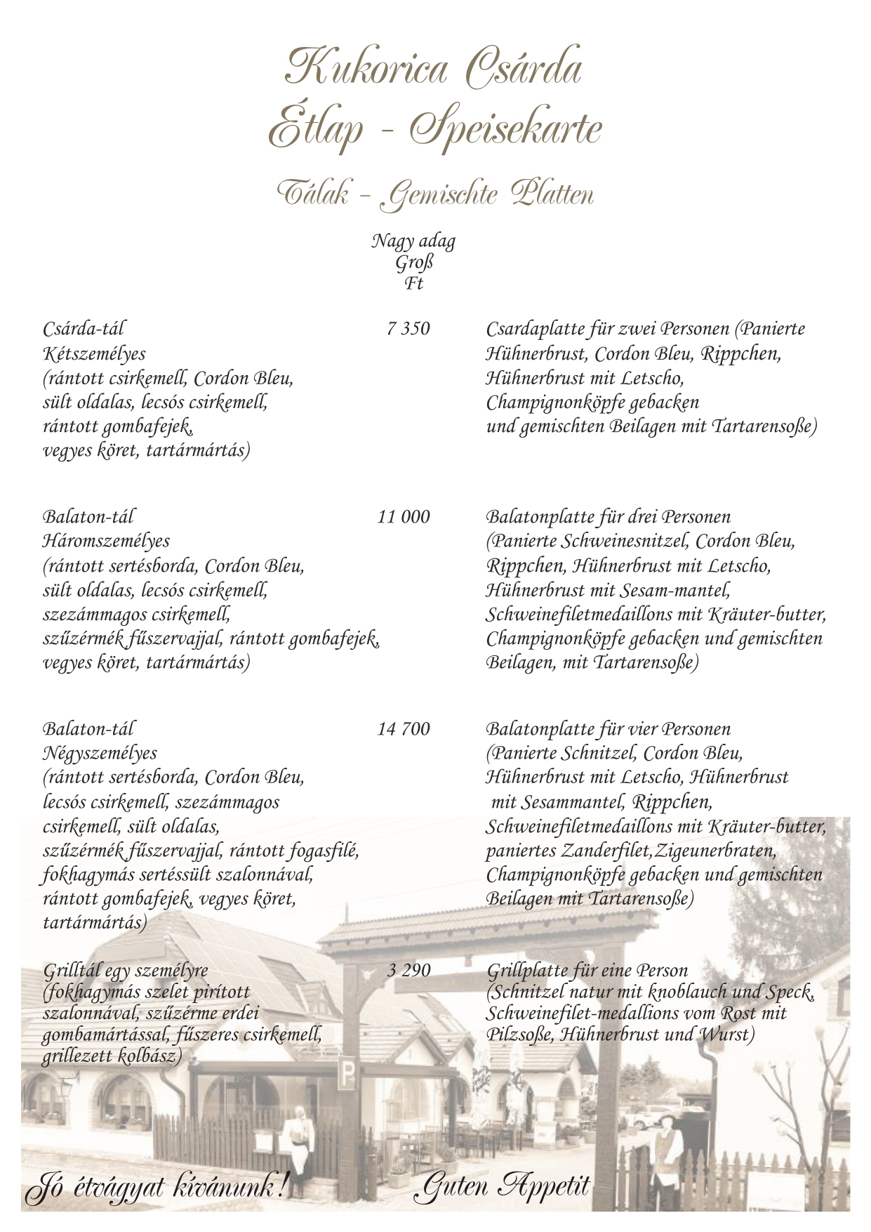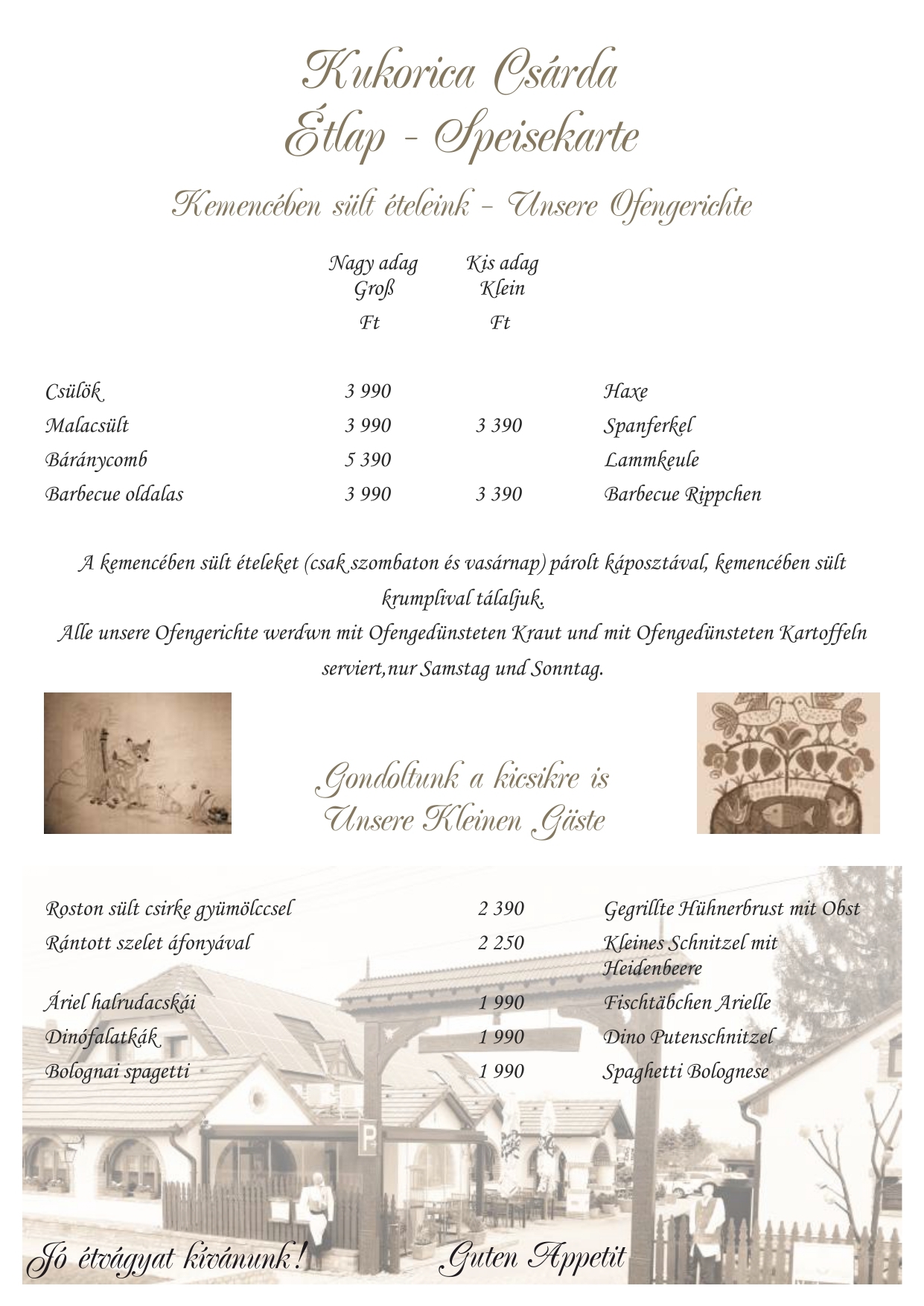 Étlapunk kínálata mellett hétfőtől péntekig napi menüt is ajánlunk, hétvégén kemencés ételeinkből -csülök, malac, barbecue oldalas, idény jellegűen bárány libacomb-közül is válogathatnak. A szombati vacsora és ebéd mellé cigányzenével szórakoztatjuk kedves vendégeinket. Nálunk lehetőség nyílik különféle rendezvények szervezésére (ballagás, esküvő, születésnap, keresztelő, osztálytalálkozó, baráti összejövetel). Étlapunkat angol, német és olasz nyelven is olvashatják.