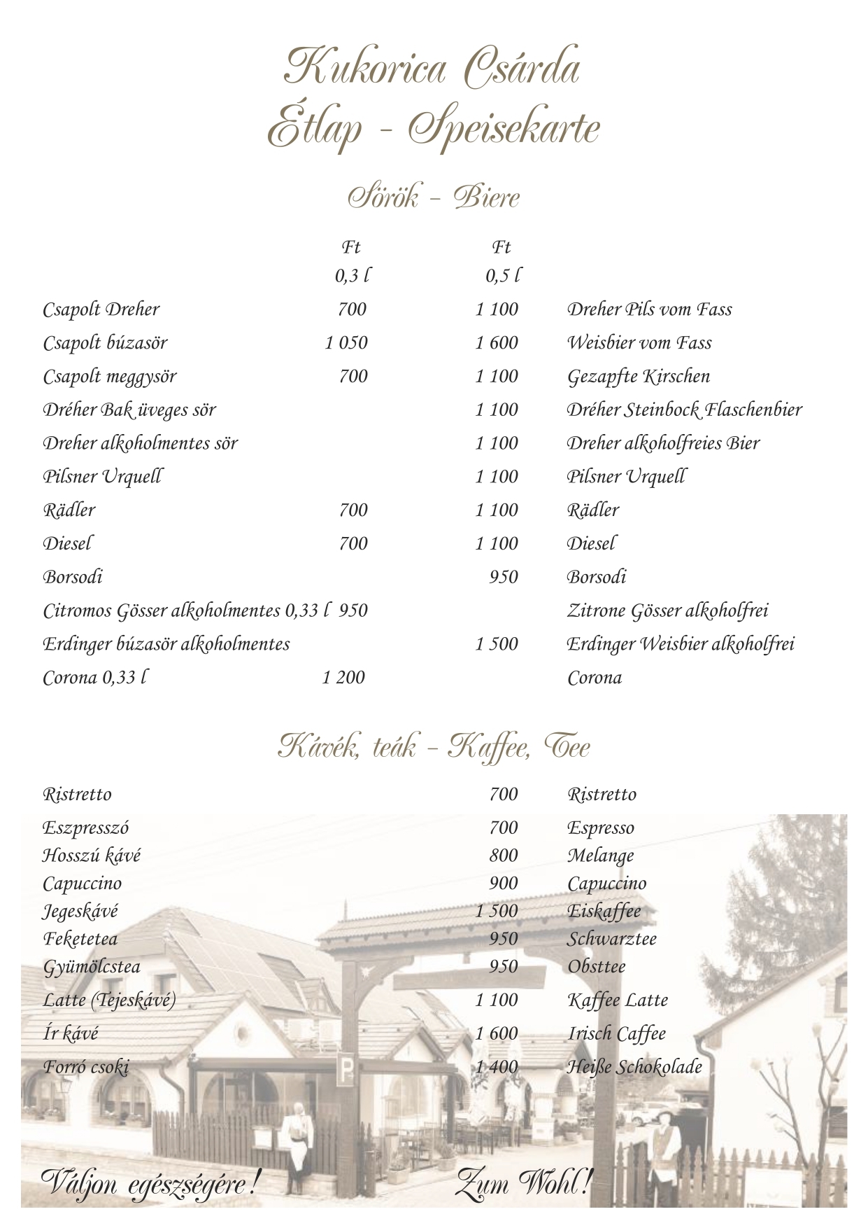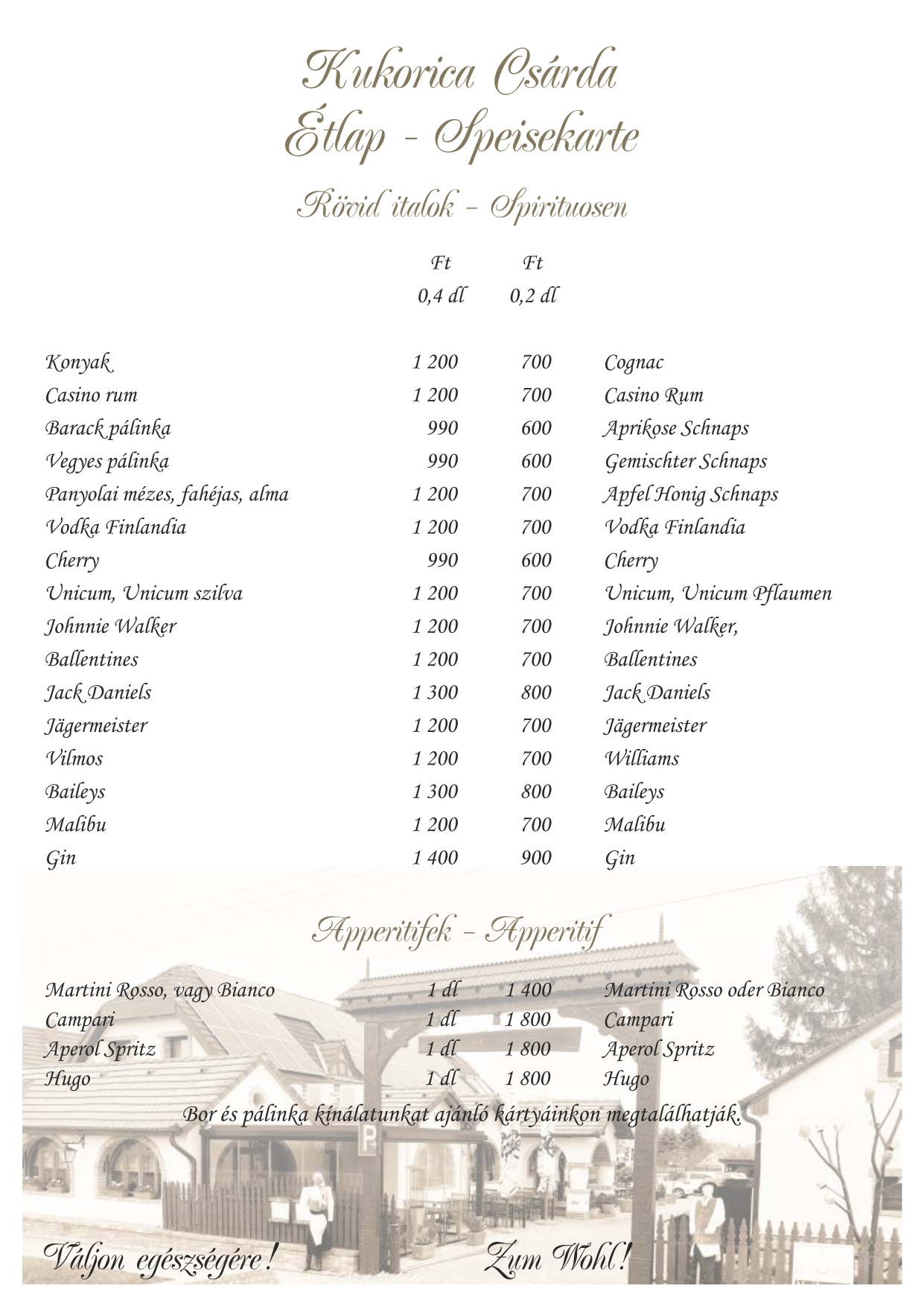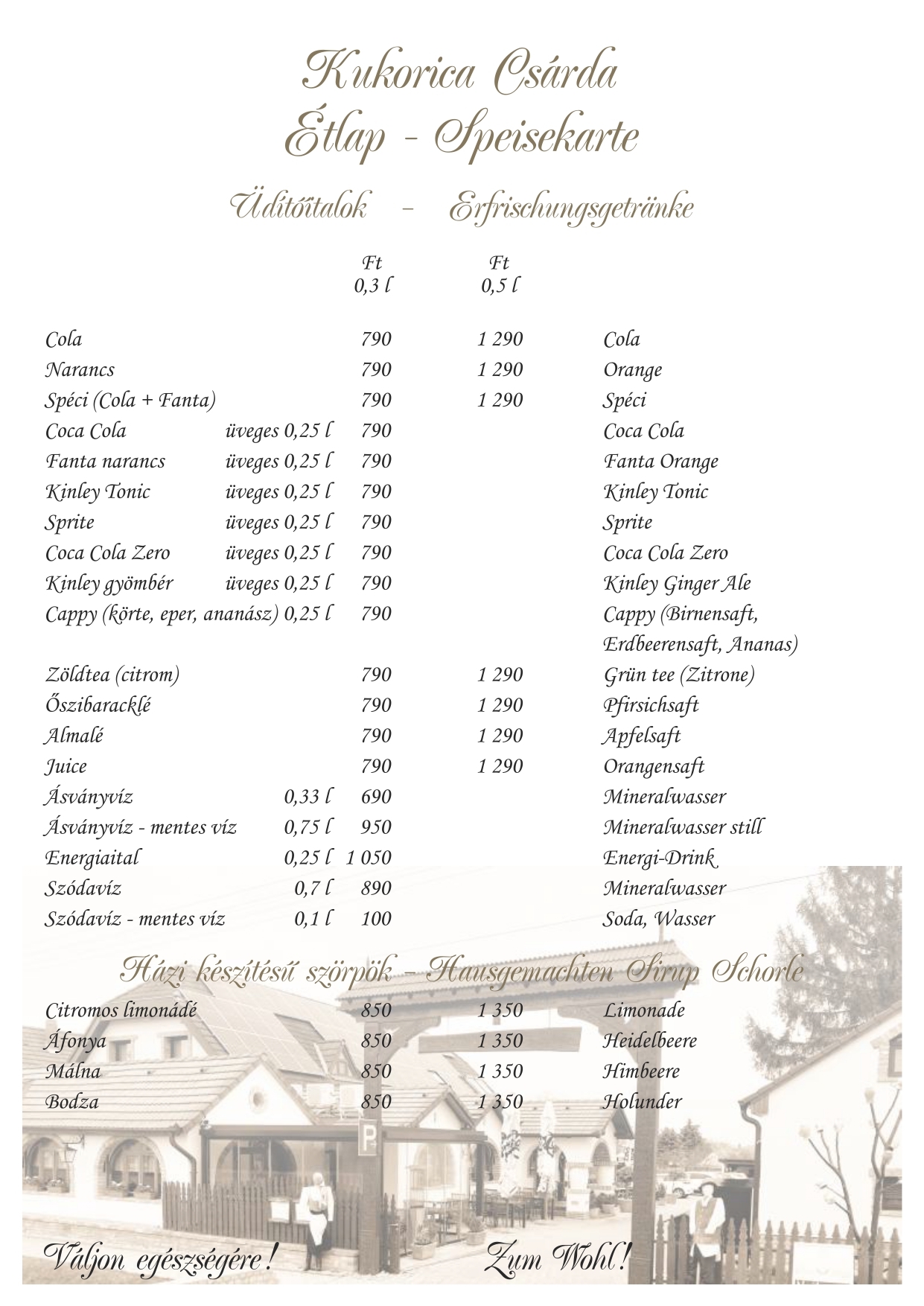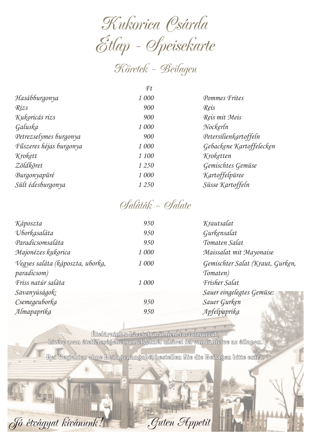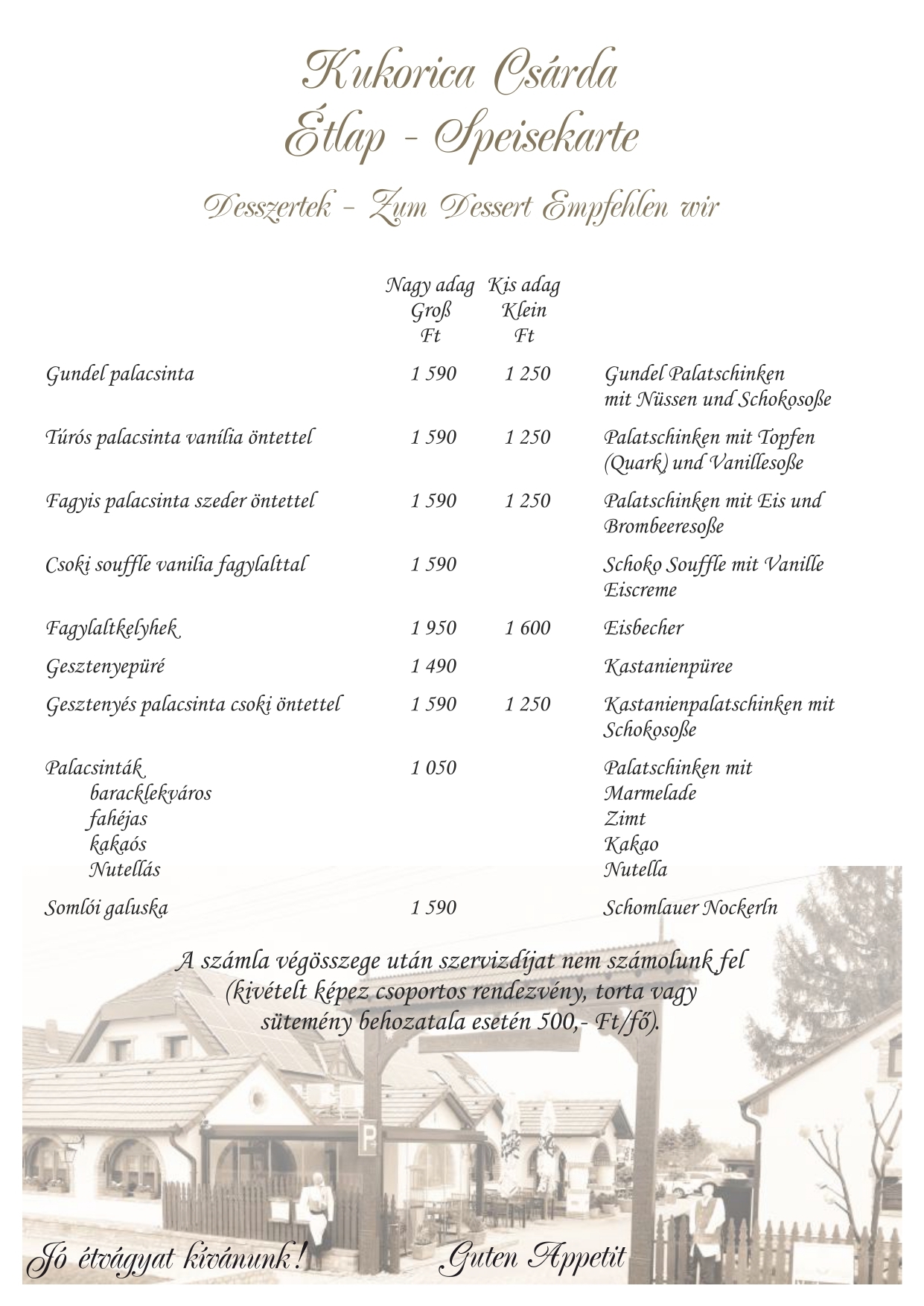 Étlapunk kínálata mellett hétfőtől péntekig napi menüt is ajánlunk, hétvégén kemencés ételeinkből -csülök, malac, barbecue oldalas, idény jellegűen bárány libacomb-közül is válogathatnak. A szombati vacsora és ebéd mellé cigányzenével szórakoztatjuk kedves vendégeinket. Nálunk lehetőség nyílik különféle rendezvények szervezésére (ballagás, esküvő, születésnap, keresztelő, osztálytalálkozó, baráti összejövetel). Étlapunkat angol, német és olasz nyelven is olvashatják.