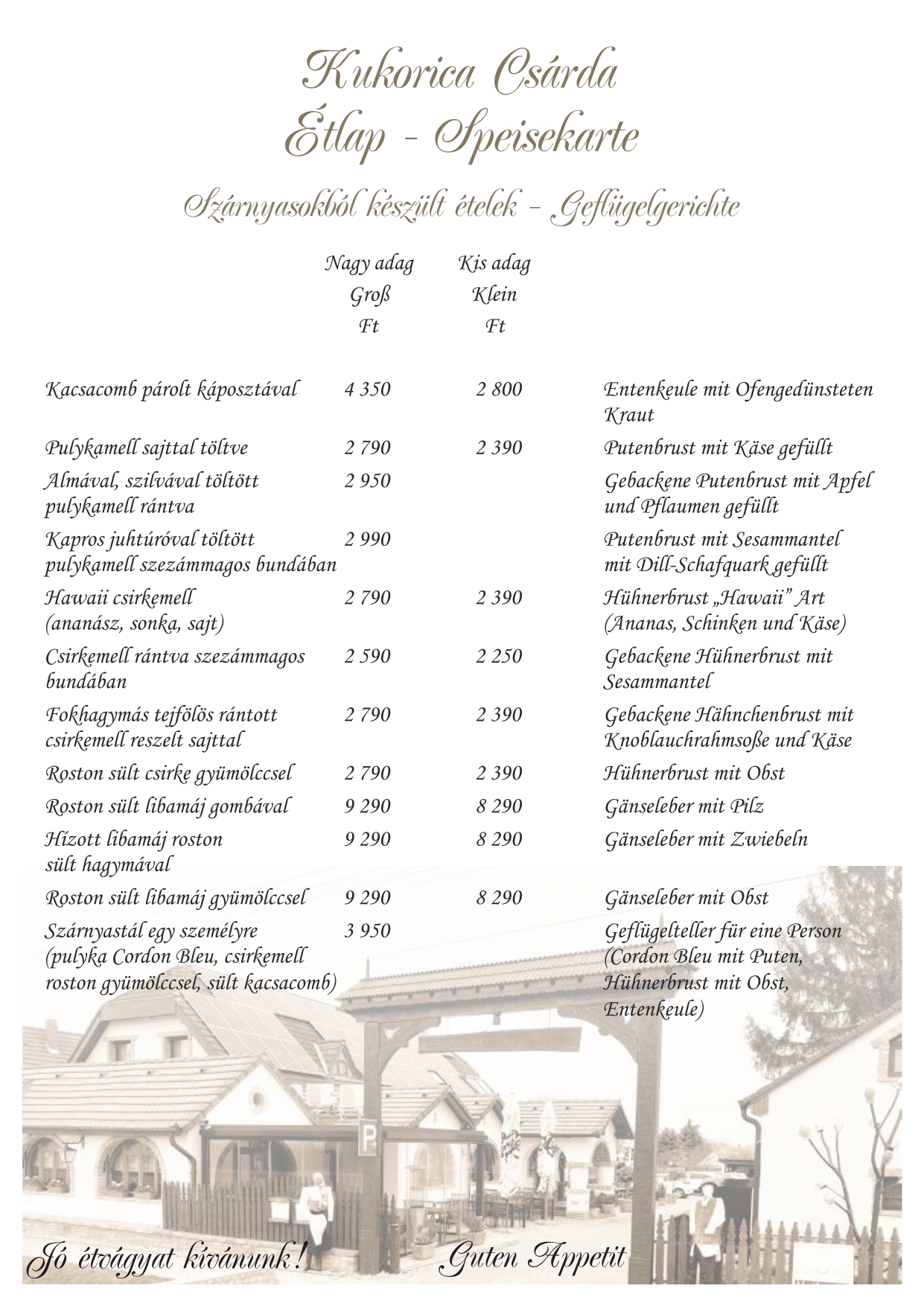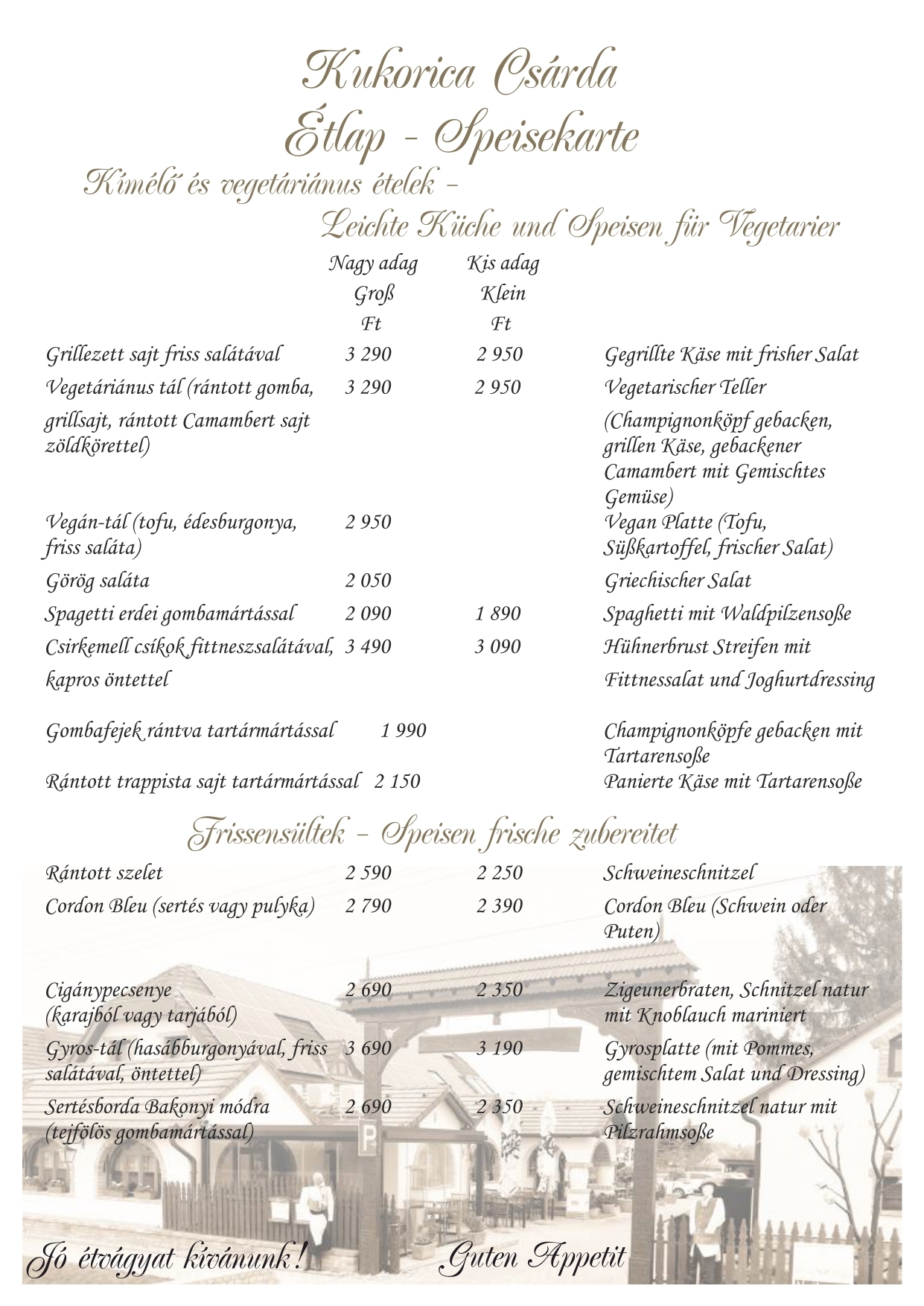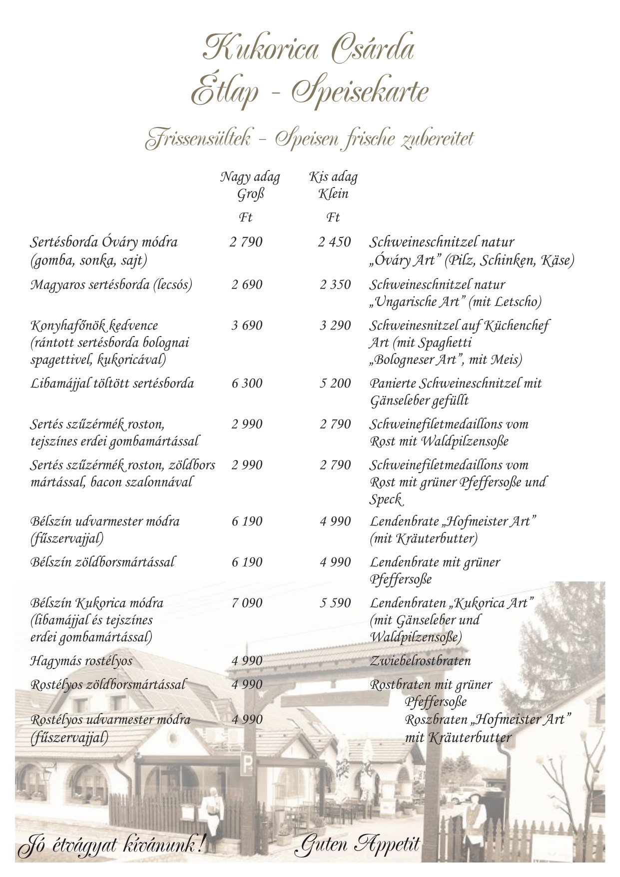 Konyhánkat a magyar hagyományokon alapuló ízvilág jellemzi, de étlapunkon megtalálhatók vegetáriánus, illetve kímélőbb szárnyas ételek, halak, vadak. Reméljük felkeltettük érdeklődését és ellátogat hozzánk.